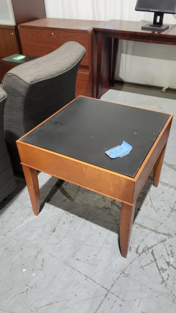 Description Black and Maple End Table. Ideal for a living area, waiting room, or office.