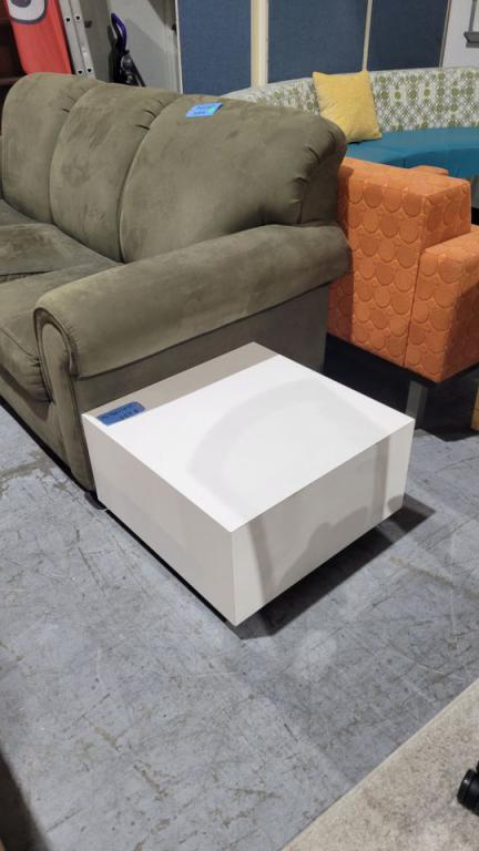 Description White Coffee Table. Low profile, contemporary, laminate design. Bring to a living area, work space, or waiting room. Sleek and modern.