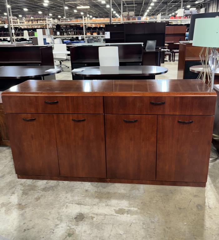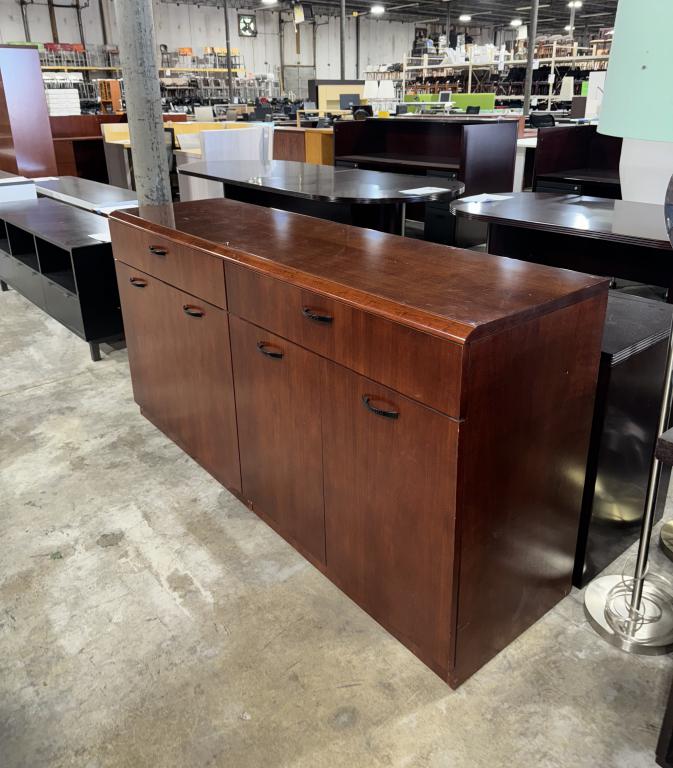 Description Indiana Cherry Credenza: Crafted to perfection, the Indiana Cherry Credenza boasts a lustrous cherry finish complemented by black pull handles. It offers practicality with two spacious top drawers and double doors that conceal adjustable shelving.*WHS_0724*