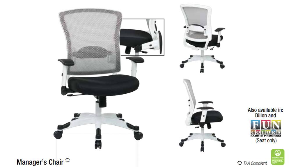 We have this Office Star Grey & Black Manager’s Chair with a White Frame Nylon Coated Base that is 26” W x 24.75” D x 40.5-44.75” H.