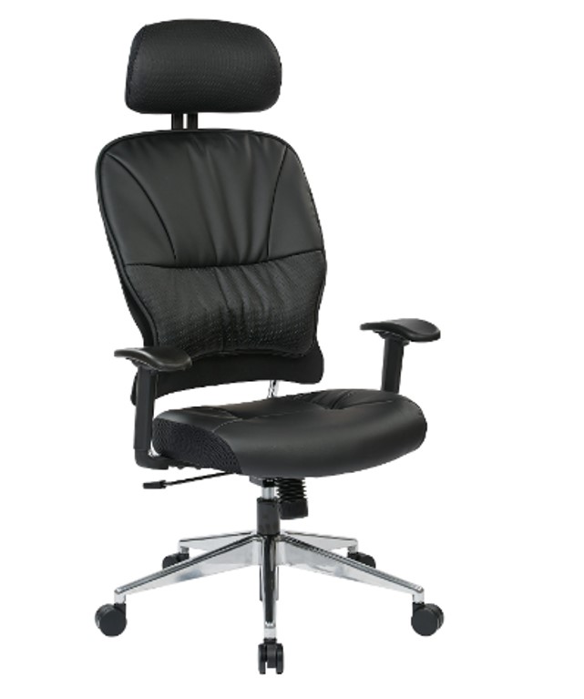 Black Bonded Executive Leather Seat & Back w/ Adjustable Headrest, Arms, and a polished Aluminum Base.