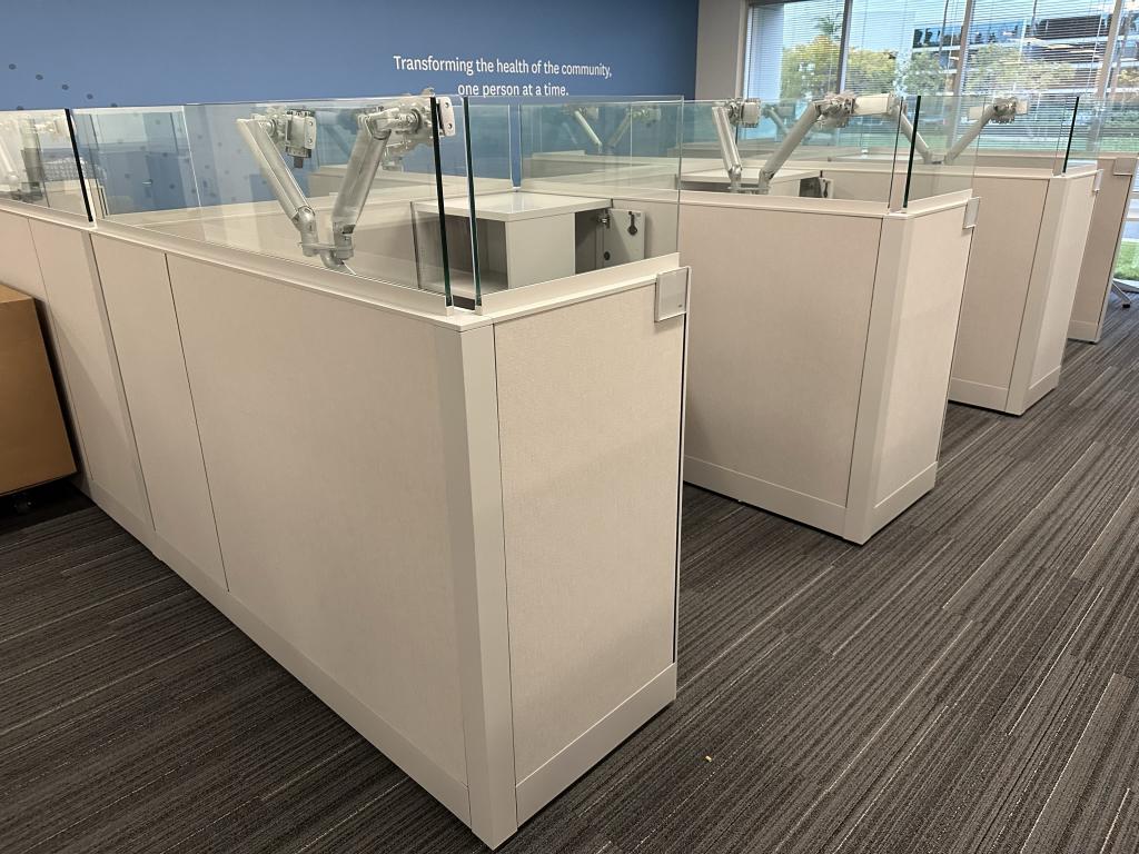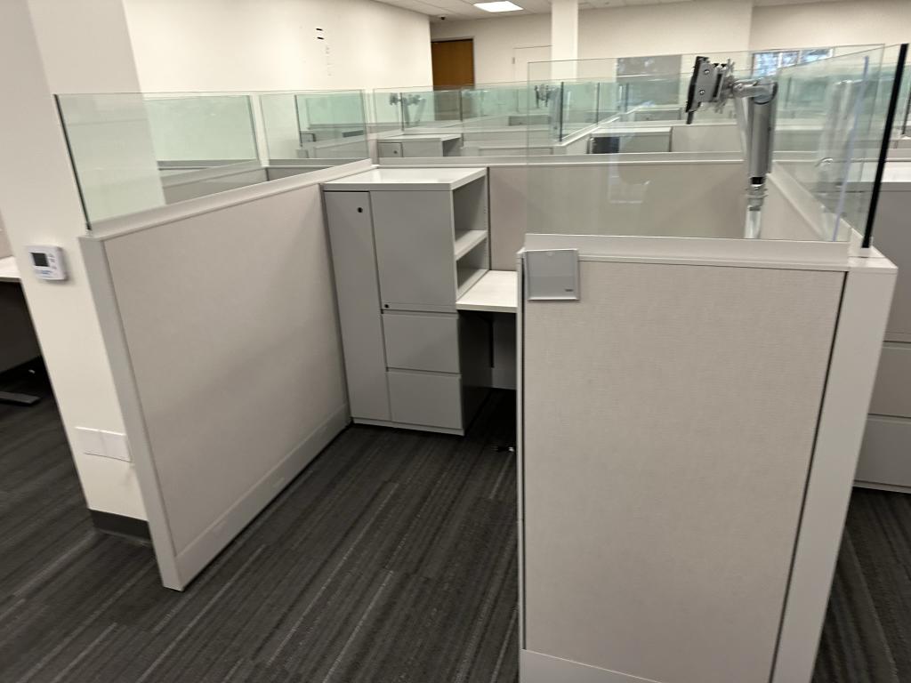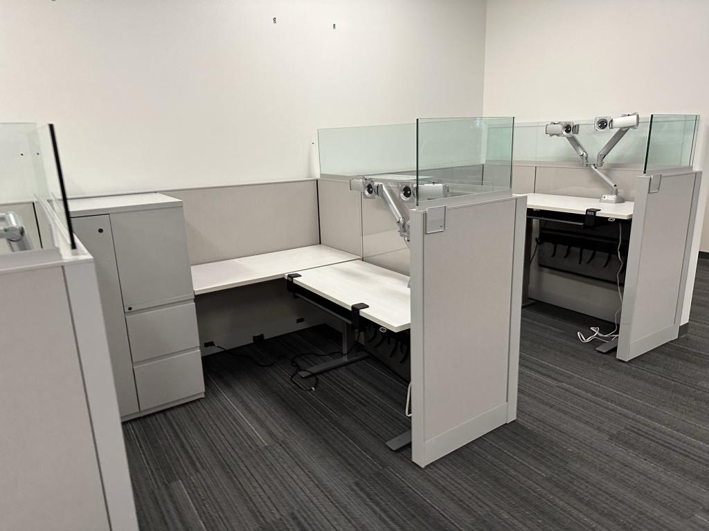 Knoll Dividend 6’x6′ with height adjustable in every station. The height adjustable are made by Linak. Storage towers, dual monitor arms and everything seen pictured included.