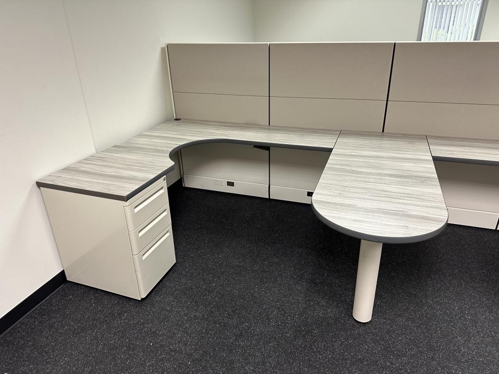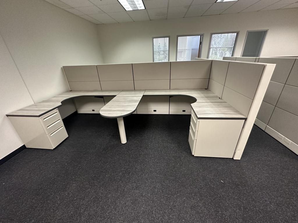 The file cabinets are a new teal inner tone finish with matching trim. These stations can also be modified for smaller spaces to a 5’x5’ by removing the shared peninsula.