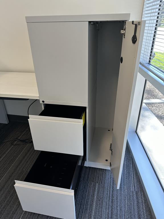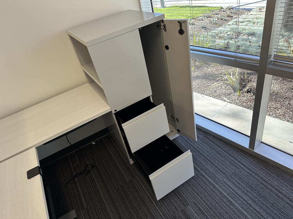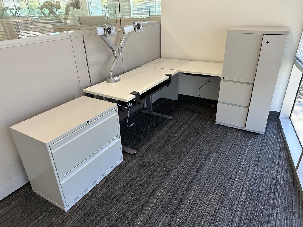 We have this KNoll 6’x6′ modern L shaped Height Adjustable Desk set up from Knoll and Linak. The desktop is Knoll and the base is Linak just 2 years old and never been used.