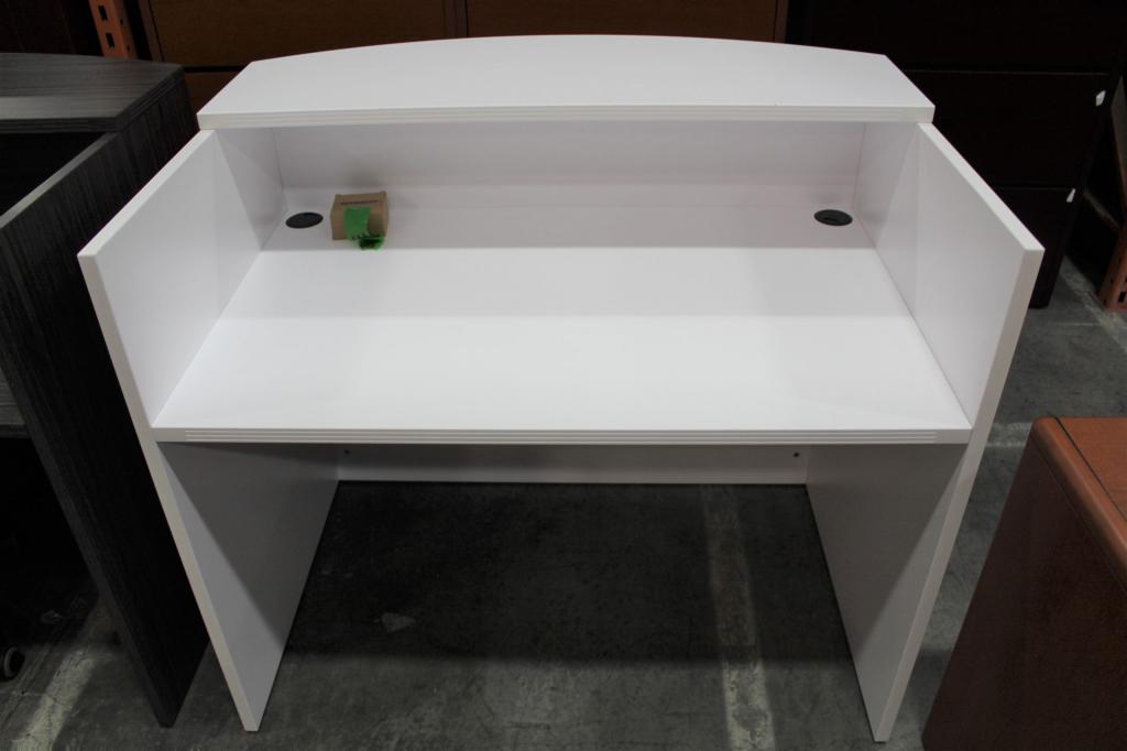 This modern reception desk is 4’x3′ with a 42″ tall transaction top and is available in 6 finishes.