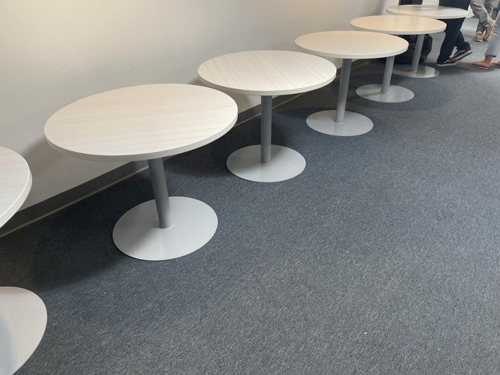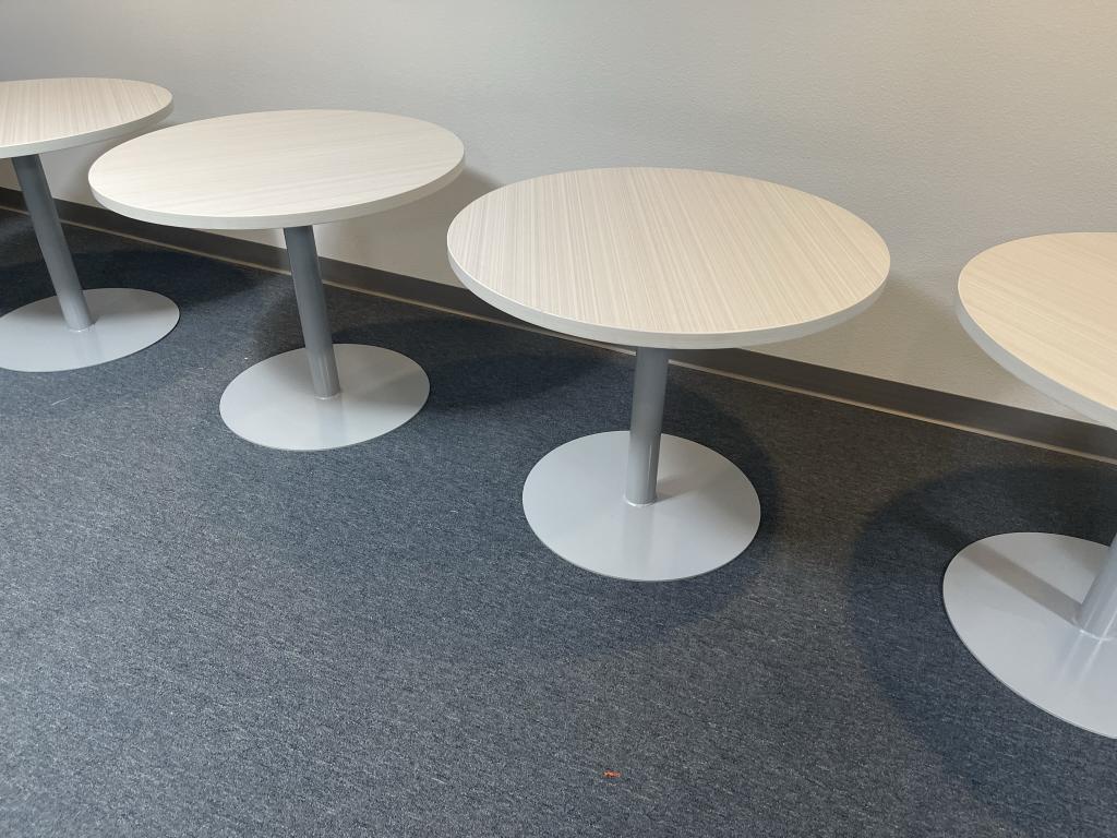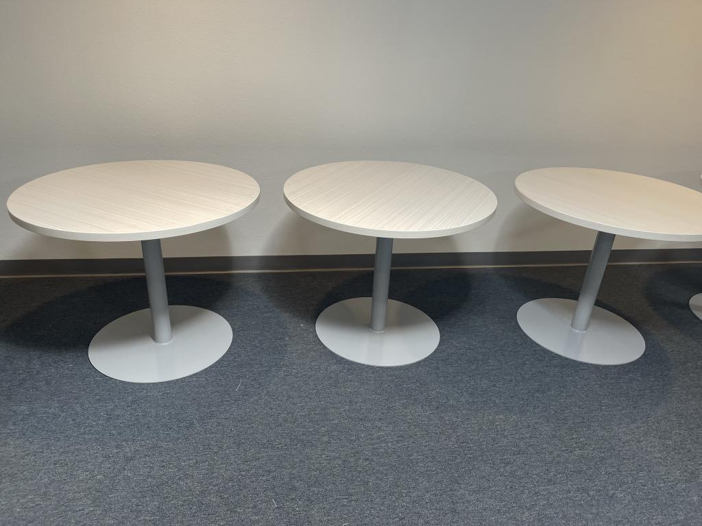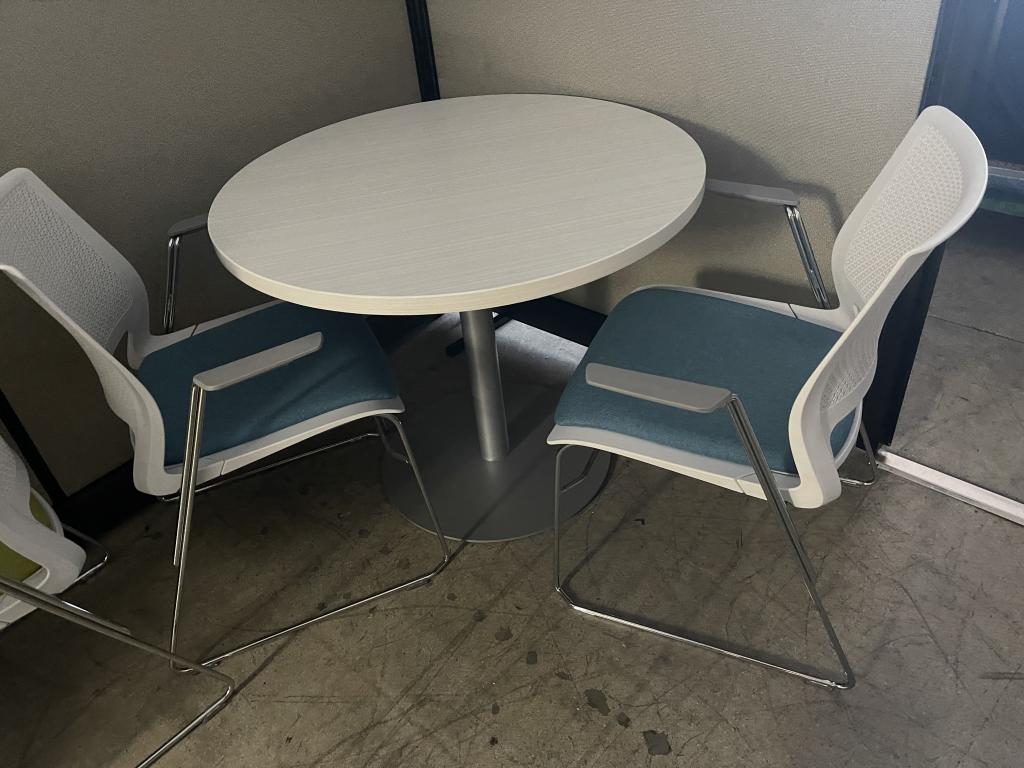 We have 3′ wide round Blondewood meeting tables available by Steelcase. The base is solid steal and a heavy commercial grade that creates a solid foundation to the meeting table. The top is with new laminate and the base is pre owned refurbished painted to look like new.